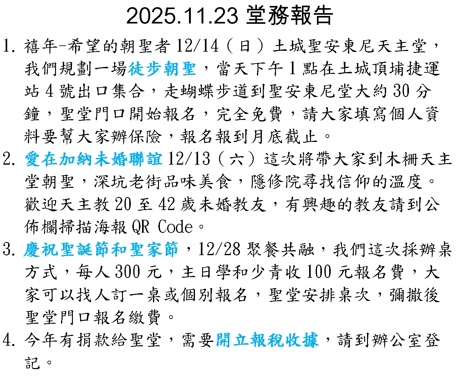 ★ 堅振聖事課程 還未領授【堅振聖事】者,請先到辦公室報名登記,等候通知上課時間,並提供領洗證明單。請與本堂神父聯繫。